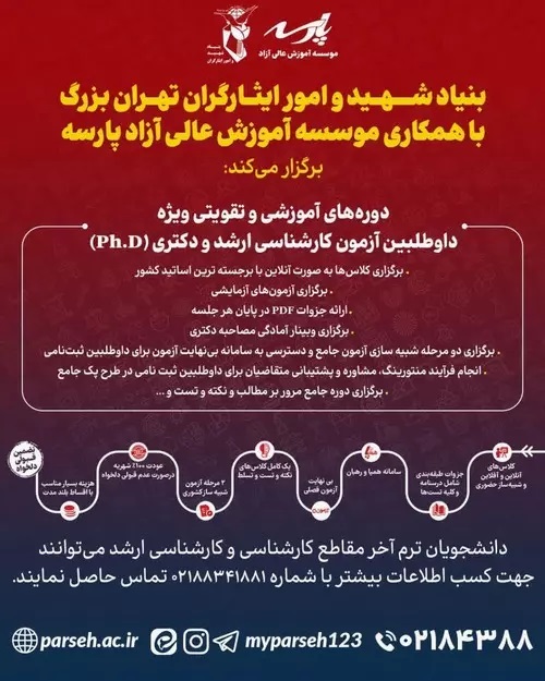 پیرو تفاهم نامه فی ما بین بنیاد شهید تهران بزرگ و موسسه آموزش عالی آزاد پارسه، امکان استفاده از دوره های آموزشی و تقویتی ویژه کنکور ارشد و دکتری برای دانشجویان شاهد و ایثارگر شاغل به تحصیل در ترم آخر دانشگاه ها، با تخفیف 50 درصد فراهم گردیده است . جهت کسب اطلاعات بیشتر به لینک زیر مراجعه نمایید.