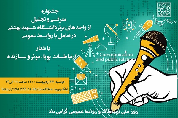 نخستین جشنــواره معرفـی و تجلیــل از واحدهـای برتـر دانشگـاه شهیـد بهشتـی در تعامل با روابط عمومی، همزمان با 27 اردیبهشت روز ارتباطات و روابط عمومی، از ساعت 11 تا 13 به صورت مجازی برگزار شد.