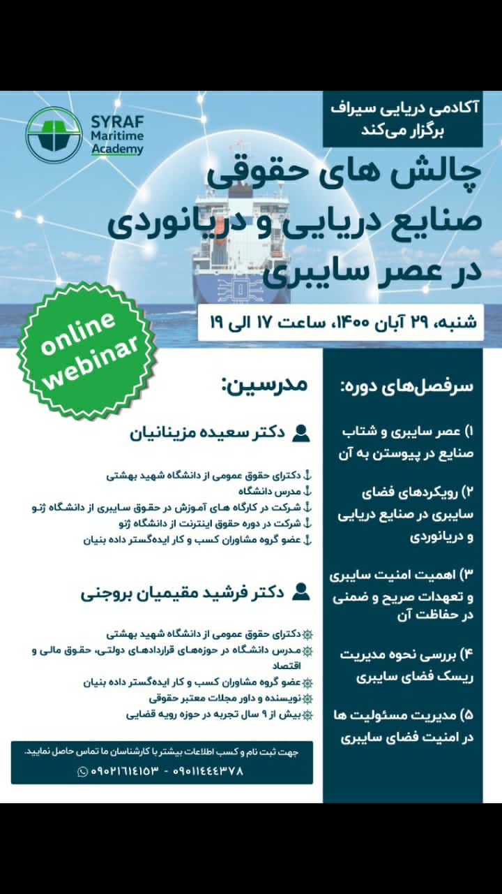 براساس اهمیت شتابدهی و تاثیرات موثر آن در حوزه فضای امنیت سایبری در حوزه حقوق دریایی این وبینار برگزار  خواهد شد.