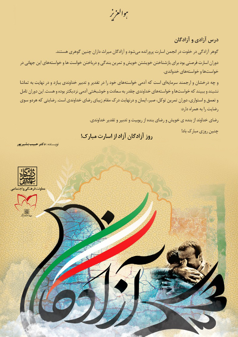 گوهر آزادگی در خلوت در انجمن اسارت پرورانده می شود و آزادگان میراث داران چنین گوهری هستند.