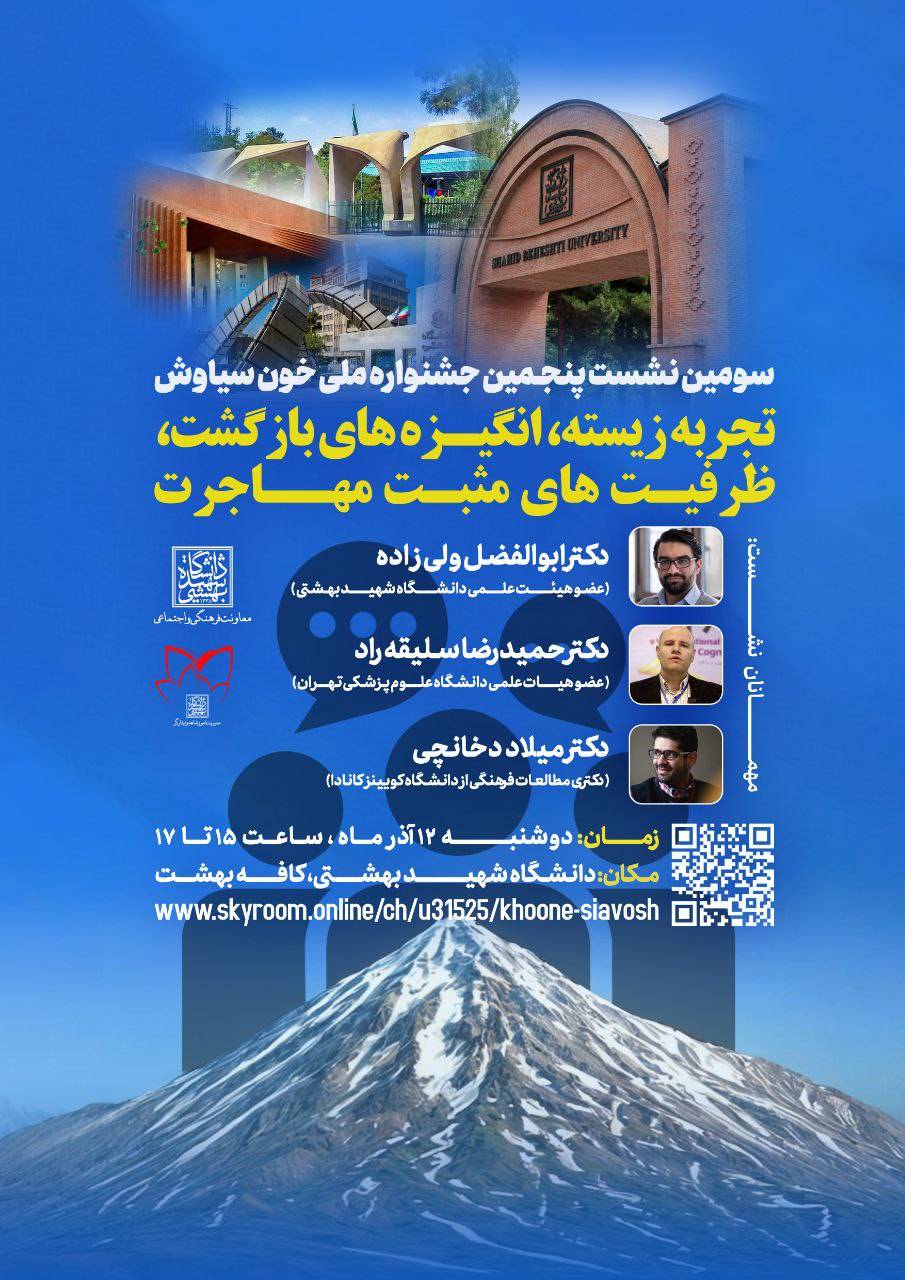 سومین نشست از سلسله نشستهای جشنواره خون سیاوش، با موضوع تجربۀ زیسته ظرفیتهای مهاجرت و انگیزۀ بازگشت نخبگان دوشنبه 12 آذرماه با حضور دکتر ولیزاده عضو هیئت علمی دانشگاه شهید بهشتی و دکتر سلیقهراد عضو هیئت علمی دانشگاه علوم پزشکی تهران برگزار شد.